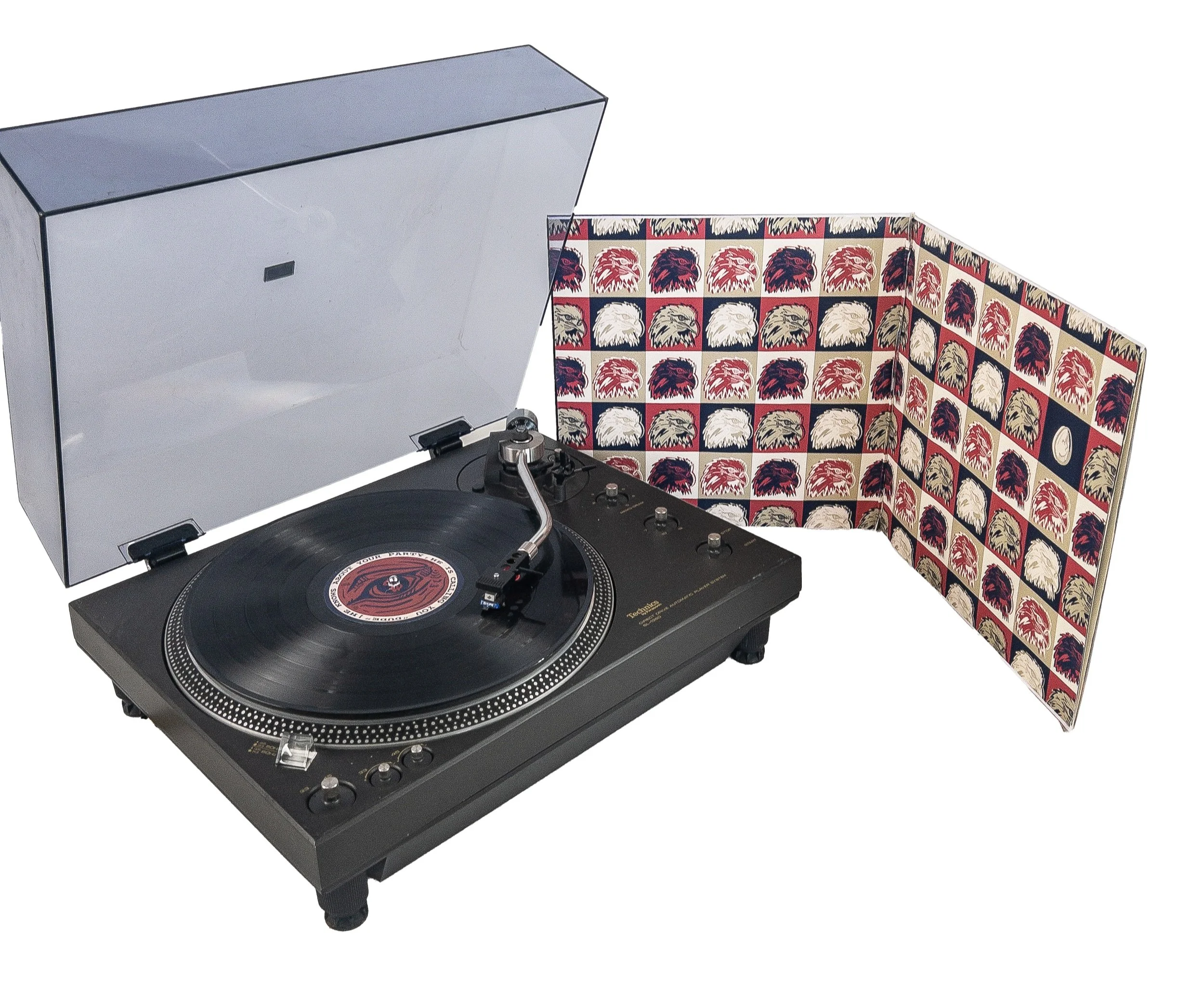 In this project, I delved into the theme of duality through imagery, color, and layout. The album cover features an eagle, embodying both the title and a critique of society. Rather than its typical protective nature, the eagle is depicted with an aggressive demeanor, underscored by a dollar sign in its eye, symbolizing the disregard for the common man in a capitalist society. In contrast, the back cover showcases a nest with a cracked egg beneath the tracklist, representing the neglect of the eagle, reinforcing its role as a figure of aggression rather than comfort. The inside spread features a pattern of the eagle, alternating in color, with one cracked egg among them, further emphasizing the duality and stripping away the nurturing connotations typically associated with the bald eagle. The vinyl sticker displays the eagle's eye alongside a quote from the title track: “He is calling you DUDE!” This lyric references an unnamed man who “is handling the money,” “knows about your party,” and “is serving the food,” reflecting his superior status and nonchalance regarding the plight of the common man. This concept of neglect, embodied by the greedy eagle and its unheeded progeny, serves as the driving force behind my design.